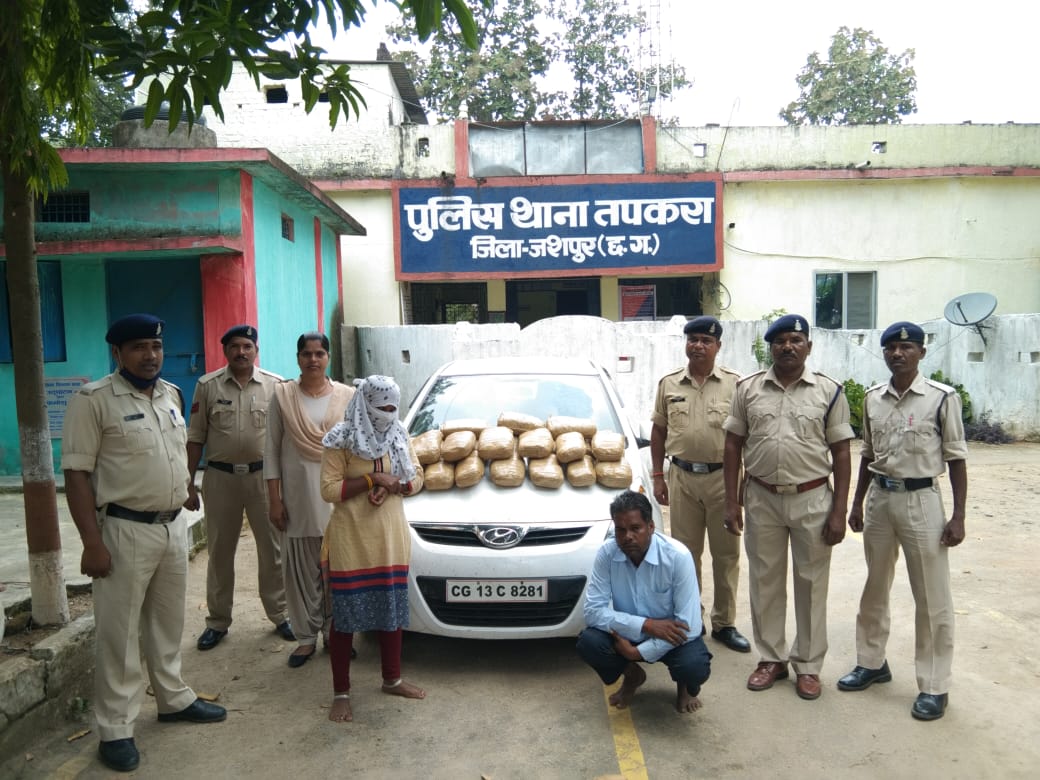पुलिस से मिली जानकारी मुताबिक आज प्रातः में लावाकेरा चेक पोस्ट में तैनात पुलिस स्टॉफ द्वारा प्रत्येक वाहन को रोककर बारीकी से तलाशी की जा रही थी, उसी दौरान सवेरे लगभग 08ः30 बजे ओडिसा की ओर से आ रही सफेद कलर की हुंडाई आई 20 कार क्रमांक CG 13 C 8281 को रोककर बारीकी से तलाशी लेने पर कार में सवार 02 व्यक्ति से कार की डिक्की से प्लास्टिक की थैली में छिपाकर रखे मादक पदार्थ गांजा 23 पैकेट में कुल 23 किलोग्राम को पुलिस द्वारा जब्त कर तस्करी में संलिप्त आरोपी-मनोज विस्वकर्मा एवं मेघा कश्यप को अभिरक्षा में लिया गया, तस्करी में संलिप्त कार ड्राईवर फरार हो गया। पुलिस द्वारा पूछताछ में आरोपियों ने उक्त मादक पदार्थ गांजा को ओड़िसा के झारसुगुड़ा से क्रय कर मध्यप्रदेश के छतरपुर ले जाना बताये। प्रकरण में गांजा तस्करी में प्रयुक्त कार को जब्त कर आरोपी मनोज विश्वकर्मा उम्र 35 वर्ष निवासी ग्राम पाय थाना राजनगर जिला छतरपुर (म.प्र.) एवं मेघा कश्यप उम्र 34 वर्ष निवासी गोसलपुर थाना गोसलपुर जिला जबलपुर (म.प्र.) को आज गिरफ्तार कर न्यायिक अभिरक्षा में भेजा गया।