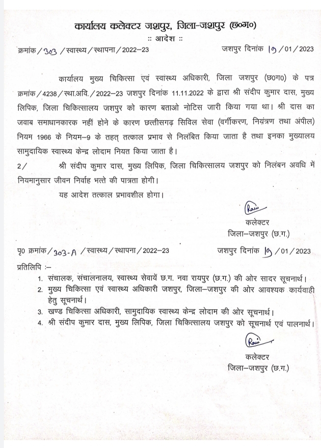 जशपुर । कलेक्टर डॉ रवि मित्तल ने जिला चिकित्सालय जशपुर के मुख्य लिपिक संदीप कुमार दास की कार्य में घोर लापरवाही और अनुशासनहीनता की शिक़ायत मिलने पर जांच के निर्देश दिए थे। जांच प्रतिवेदन के आधार पर मुख्य चिकित्सा एवं स्वास्थ्य अधिकारी ने दिनांक 11.11.2022 के द्वारा संदीप कुमार दास, मुख्य लिपिक, जिला चिकित्सालय जशपुर को कारण बताओ नोटिस जारी किया गया। श्री दास का जवाब समाधानकारक नहीं होने के कारण छत्तीसगढ़ सिविल सेवा (वर्गीकरण, नियंत्रण तथा अपील) नियम 1966 के नियम-9 के तहत् तत्काल प्रभाव से निलंबित करते हुए इनका मुख्यालय सामुदायिक स्वास्थ्य केन्द्र लोदाम नियत किया है।