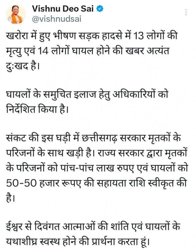 रायपुर । मुख्यमंत्री श्री विष्णु देव साय ने खरोरा क्षेत्र में हुई भीषण सड़क दुर्घटना पर गहरा शोक व्यक्त करते हुए मृतकों के परिजनों के प्रति संवेदना प्रकट की है। इस दुखद घटना में 13 लोगों की मृत्यु तथा 14 अन्य गंभीर रूप से घायल हुए हैं।