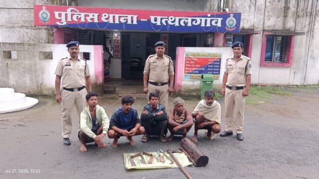 पुलिस से मिली जानकारी मुताबिक दिनांक 26.07.25 को थाना पत्थलगांव पुलिस को मुखबीर के जरिए पुख्ता सूचना मिली थी कि ग्राम तिलडेगा कटंगतराई का आरोपी चनेश राम केरकेट्टा उम्र 40 वर्ष, अपने तीन – चार साथियों के साथ मिलकर, अपने घर की बाड़ी में गौ वंश का वध किया है व उसका मांस काटकर, खाने व बिक्री करने के लिए हिस्सा बंटवारा करने वाला है, जिस पर पत्थलगांव पुलिस के द्वारा मामले के संबंध में वरिष्ठ पुलिस अधिकारियों को अवगत कराते हुए, वरिष्ठ पुलिस अधीक्षक जशपुर शशि मोहन सिंह के दिशा निर्देश पर तत्काल मुखबिर के बताए स्थान पर रवाना होकर, आरोपियों की धर पकड़ हेतु, चनेश राम केरकेट्टा की बाड़ी की घेरा बंदी की गई ,जहां पांच व्यक्ति गौ वंश के मांस का हिस्सा बंटवारा करते पाए गए, पुलिस के द्वारा त्वरित कार्यवाही करते हुए मौके से पांचों आरोपियों को हिरासत में लिया गया व उनके कब्जे से 33 किलो गौ वंश मांस सहित, गौ वंश के वध व मांस काटने में प्रयुक्त औजार को जब्त कर लिया गया।