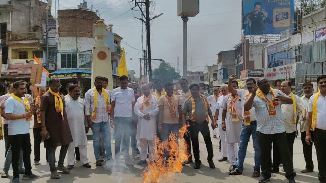 जशपुर। कुनकुरी के कांग्रेसी नगर पंचायत अध्यक्ष विनयशील की आपत्तिजनक फेसबुक पोस्ट से अग्रवाल समाज का आक्रोश फूटा है।गुरुवार को समाज के सैकड़ों लोग सड़कों पर उतरे, और जय स्तम्भ चौक पर विनयशील का पुतला दहन किया और कड़ी नारेबाजी के साथ विरोध प्रदर्शन किया।
