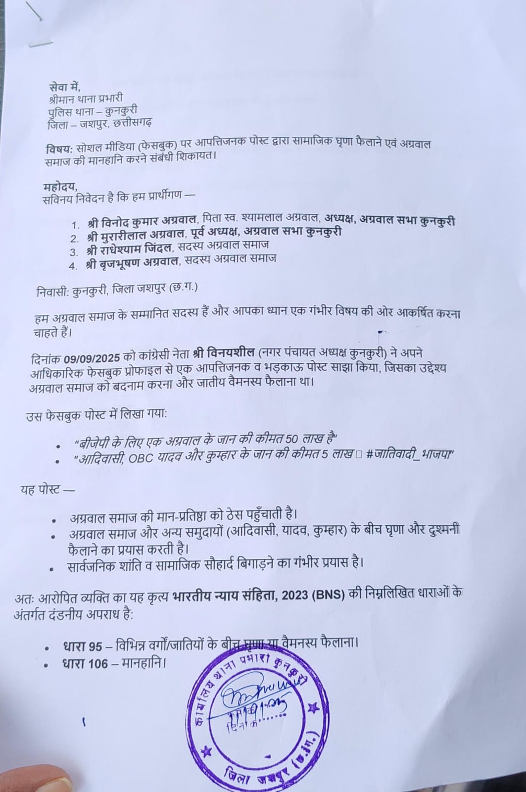 अग्रवाल सभा कुनकुरी के अध्यक्ष विनोद कुमार अग्रवाल, पूर्व अध्यक्ष मुरारीलाल अग्रवाल, राधेश्याम जिंदल और बृजभूषण अग्रवाल ने आवेदन में कहा कि विनयशील ने फेसबुक पर भड़काऊ और अमर्यादित पोस्ट लिखी।