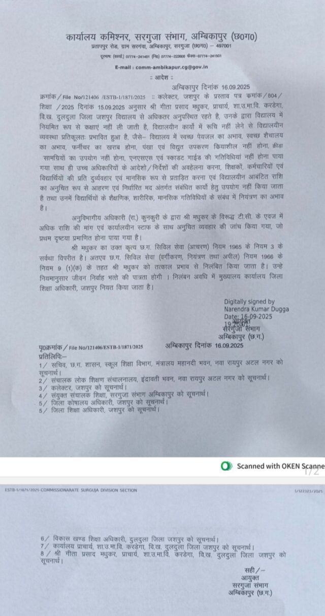 जशपुर। सरगुजा कमिश्नर नरेंद्र कुमार दुग्गा ने जशपुर जिले के शासकीय उच्चतर माध्यमिक विद्यालय मे पदस्थ प्राचार्य गीता प्रसाद मधुकर को निलंबित किया है।