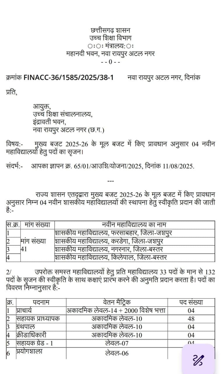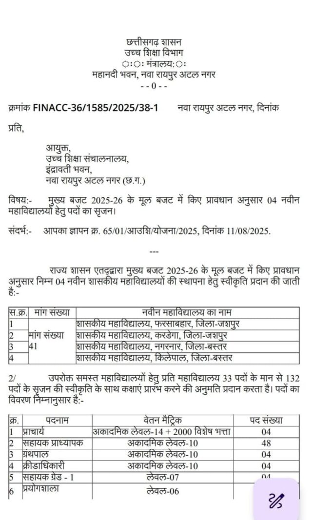 जशपुर। छत्तीसगढ़ में उच्च शिक्षा के विस्तार के लिए मुख्यमंत्री विष्णुदेव साय लगातार प्रभावी कदम उठा रहे हैं। अब मुख्यमंत्री ने जशपुर जिले के फरसाबहार एवं करडेगा महाविद्यालयों के संचालन के लिए शिक्षकीय और कार्यालयीन कर्मचारियों की पदस्थापना की स्वीकृति दी है। इस कदम से प्रदेश के शिक्षा क्षेत्र में युवाओं को उच्च शिक्षा के अवसर मिलने की दिशा में एक नया अध्याय शुरू होगा। मुख्यमंत्री की इस पहल से जशपुर जिले के फरसाबहार, दुलदुला के करडेगा ,बस्तर के नगरनार और किलेपाल में नवीन महाविद्यालयों का संचालन संभव हो सकेगा। छत्तीसगढ़ उच्च शिक्षा विभाग ने इन महाविद्यालयों के लिए एक-एक प्राचार्य, 48 सहायक प्राध्यापक, 4 ग्रंथपाल, 4 क्रीड़ाधिकारी और 4 प्रयोगशाला सहायक पदों की स्वीकृति दी है। अब राज्य सरकार इन पदों पर भर्ती की प्रक्रिया शीघ्र शुरू करेगी।