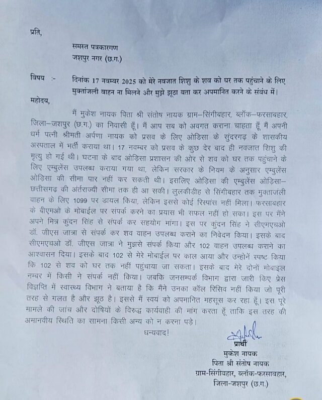 जशपुर। जिले में प्रशासनिक अव्यवस्था और विभागों की मनमानी एक बार फिर सुर्खियों में है। पत्रकार पिता मुकेश नायक को अपने नवजात शिशु के शव को घर ले जाने के लिए शव वाहन तक उपलब्ध न होना प्रशासन की संवेदनहीनता का ऐसा उदाहरण बन गया, जिसने जशपुर की पत्रकारिता और जनता दोनों को झकझोर दिया है।