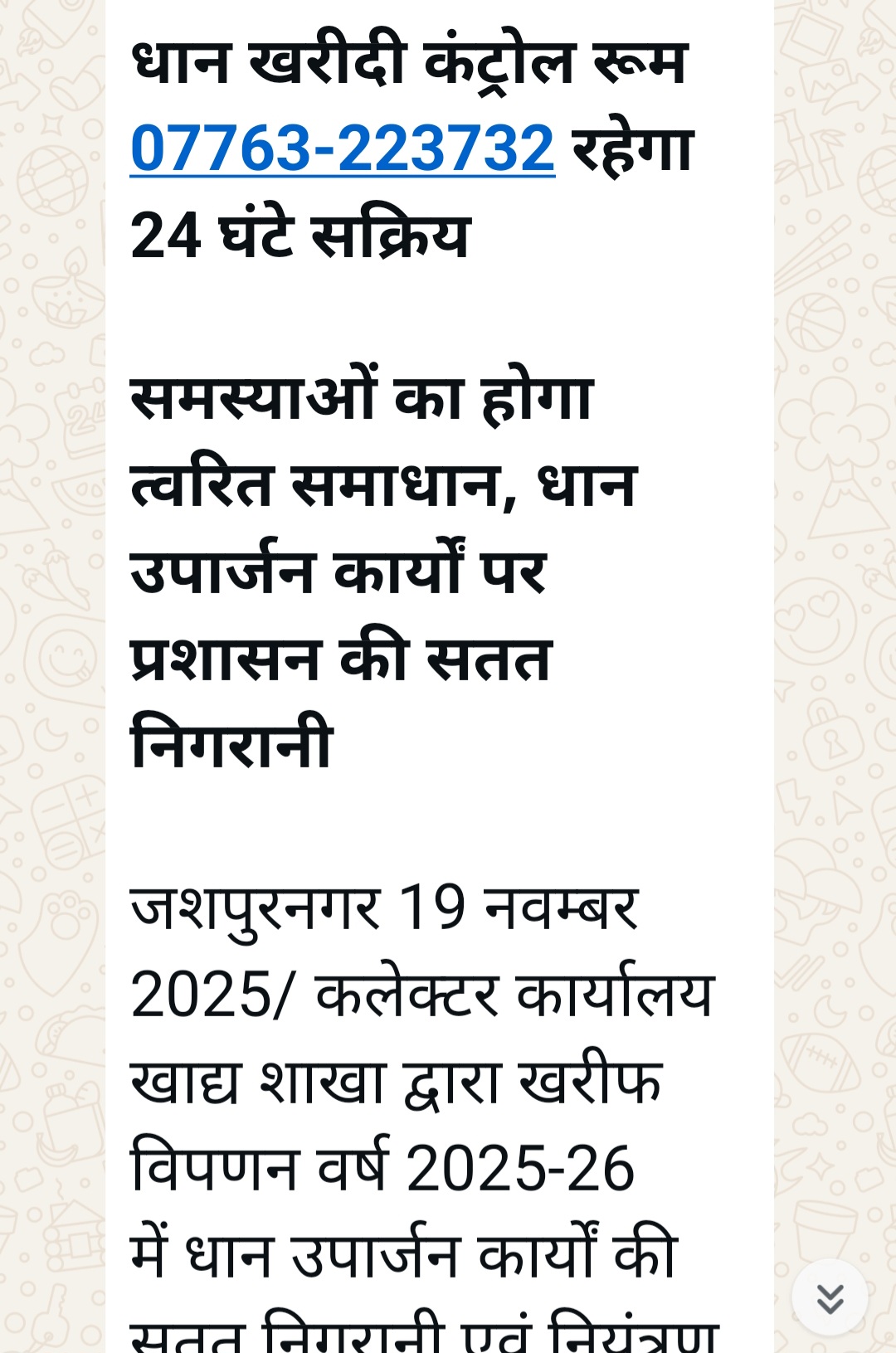 कलेक्टर कार्यालय खाद्य शाखा द्वारा खरीफ विपणन वर्ष 2025-26 में धान उपार्जन कार्यों की सतत निगरानी एवं नियंत्रण के लिए जिला स्तर पर नियंत्रण कक्ष स्थापित किया गया है। छत्तीसगढ़ शासन द्वारा जारी धान खरीदी नीति के तहत धान खरीदी अवधि में उत्पन्न समस्याओं एवं कठिनाइयों का त्वरित समाधान सुनिश्चित करने हेतु नियंत्रण कक्ष की स्थापना की गई है। अपर कलेक्टर द्वारा जारी आदेशानुसार कलेक्टोरेट कार्यालय जशपुर के द्वितीय तल में स्थित कक्ष क्रमांक 150 को धान खरीदी अवधि तक नियंत्रण कक्ष घोषित किया गया है। नियंत्रण कक्ष का दूरभाष क्रमांक 07763-223732 निर्धारित किया गया है।