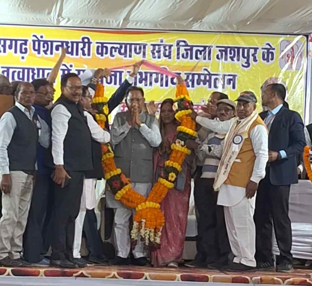 जशपुर। मुख्यमंत्री श्री विष्णुदेव साय आज ग्राम पमशाला कंवरधाम (तपकरा) में आयोजित सरगुजा संभागीय पेंशनर सम्मेलन में मुख्य अतिथि के रूप में शामिल हुए। इस अवसर पर संभाग के विभिन्न जिलों से आए लगभग एक हजार पेंशनर्स की उपस्थिति से कार्यक्रम भावनात्मक एवं गरिमामयी वातावरण में सम्पन्न हुआ। मुख्यमंत्री ने मंच में आते ही बड़ी आत्मीयता के साथ पेंशनर सदस्यों से मुलाकात की। उनका हाल चाल जाना। साथ ही उनके अच्छे स्वास्थ्य एवं उज्ज्वल भविष्य की कामना की। इस दौरान संघ के सदस्यों ने ग़जमाला से मुख्यमंत्री का स्वागत किया।