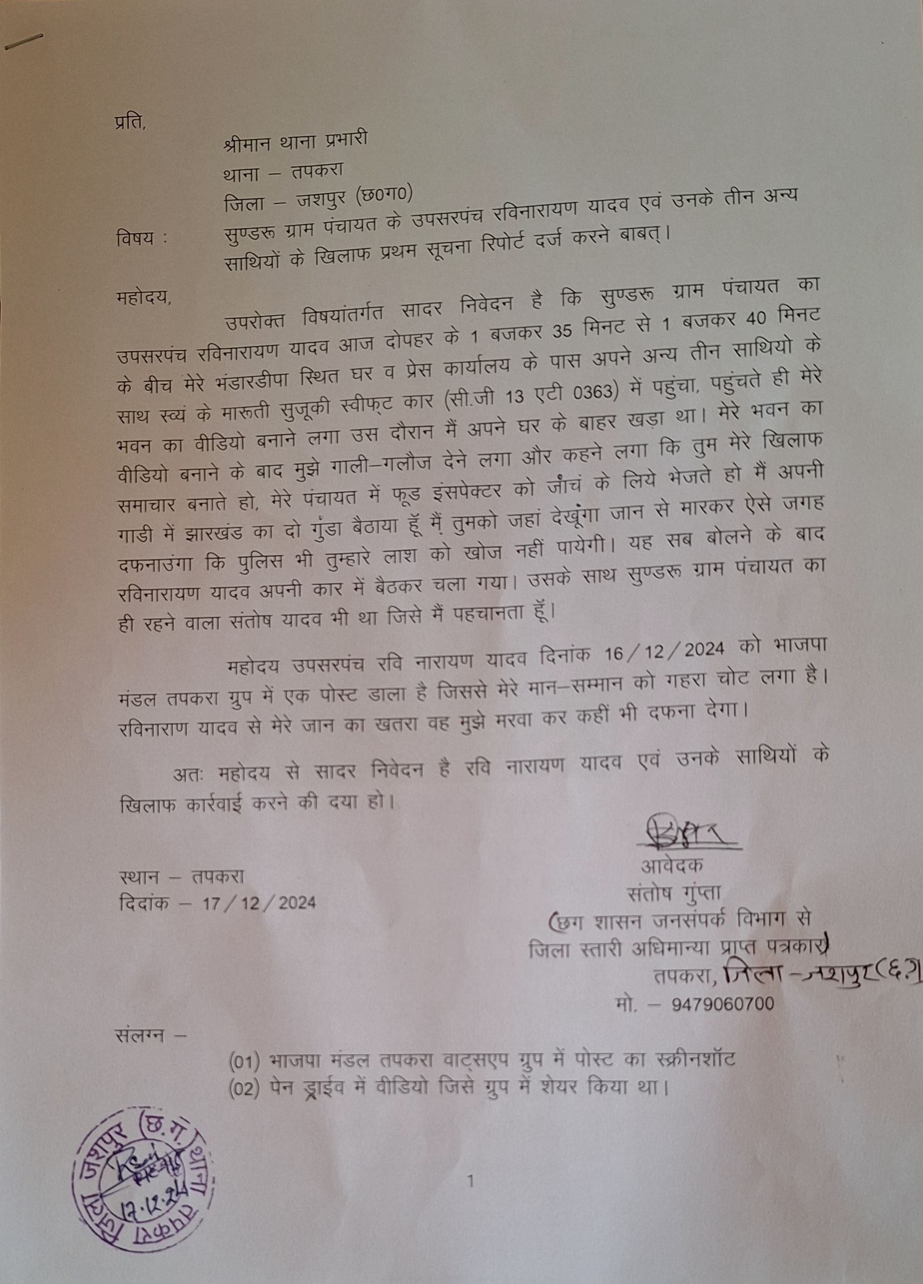 17 दिसंबर 2024 को जशपुर जिले के ग्राम पंचायत सुंण्डरू के तत्कालीन उप सरपंच व वर्तमान पंच रवि नारायण यादव दोपहर के 1:35 से 1:40 के बीच पत्रकार संतोष गुप्ता के भंडारडीपा स्थित प्रेस कार्यालय व घर के पास आकर पत्रकार संतोष गुप्ता के घर का वीडियो बनाने लगा इसी दौरान रवि नारायण यादव बोलने लगा कि तुम फरसाबहार फूड इंस्पेक्टर को भेज कर मेरे पीडीएस दुकान का समाचार बनाते हो तुम बहुत बड़े पत्रकार बन गए हो तुमको मैं जहां देखूंगा वहां काटकर फेंक दूंगा मेरी गाड़ी में अभी भी झारखंड के दो गुंडा बैठे हैं इनसे पिटवाकर यह गुंडे ऐसी जगह तुम्हारे लाश को फेकेगें की पुलिस वाले भी तुम्हारी लाश को ढूंढ नहीं पाएंगे।