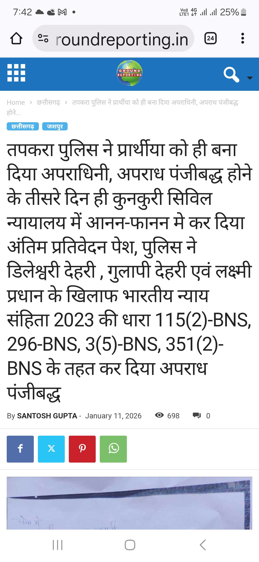 आपको बता दें 11 जनवरी 2026 दिन रविवार के दिन पत्रकार संतोष गुप्ता के द्वारा “तपकरा पुलिस ने प्रार्थीया को ही बना दिया अपराधीनी, अपराध पंजीबद्ध होने के तीसरे दिन ही कुनकुरी सिविल न्यायालय में आनन-फानन मे कर दिया अंतिम प्रतिवेदन पेश, पुलिस ने डिलेश्वरी देहरी , गुलापी देहरी एवं लक्ष्मी प्रधान के खिलाफ भारतीय न्याय संहिता 2023 की धारा 115(2)-BNS, 296-BNS, 3(5)-BNS, 351(2)-BNS के तहत कर दिया अपराध पंजीबद्ध” हेडिंग से समाचार प्रकाशित किया था । इसके बाद पुलिस हरकत में आई और आवेदिका गुलापी डेहरी के घर मसरीघाट पुलिस पहुंची थी, जिसके बाद उसके आवेदन पर 13 जनवरी 2026 को तपकरा पुलिस पदमनी बैगा के खिलाफ भारतीय न्याय संहिता 2023 की धारा 296, 115(2), 351(2), (3)5 के तहत अपराध पंजीबद्ध कर ली है। इस पूरे मामले की विवेचना तपकरा थाना में पदस्थ सहायक उप निरीक्षक प्रेमिका कुजूर के द्वारा की जा रही है।