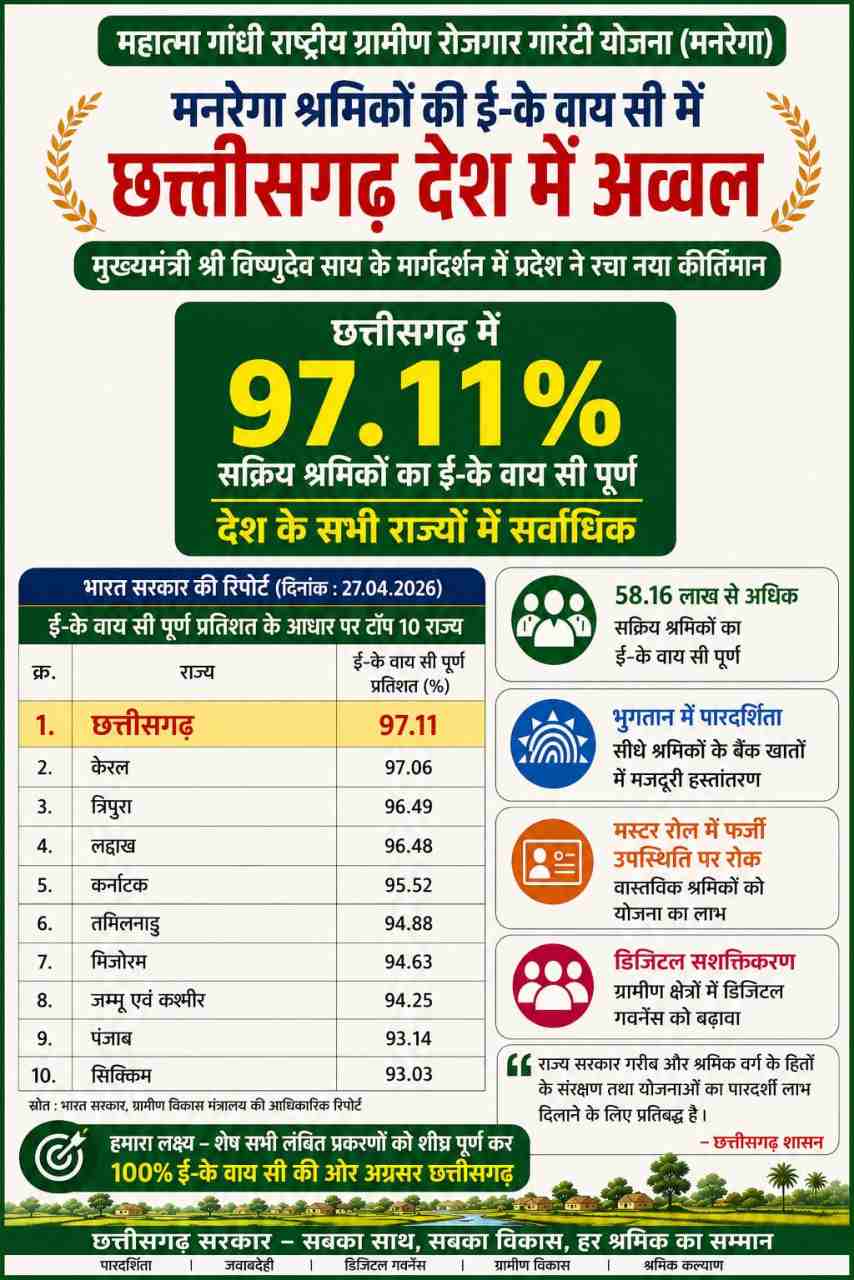महात्मा गांधी राष्ट्रीय ग्रामीण रोजगार गारंटी योजना मनरेगा के तहत श्रमिकों की ई-केवाईसी (e-KYC) प्रक्रिया को पूरा करने में छत्तीसगढ़ ने देश भर में अग्रणी स्थान हासिल किया है। प्रदेश में लगभग 58.16 लाख से ज्यादा मजदूरों की डिजिटल वेरिफिकेशन (e-KYC) पूरी की गई हैए जो भुगतान में पारदर्शिता सुनिश्चित करती है। यह डिजिटल प्रक्रिया फर्जी जॉब कार्डों को हटाने और सीधे वास्तविक लाभार्थियों के बैंक खातों में मजदूरी पहुंचाने में मदद कर रही है।